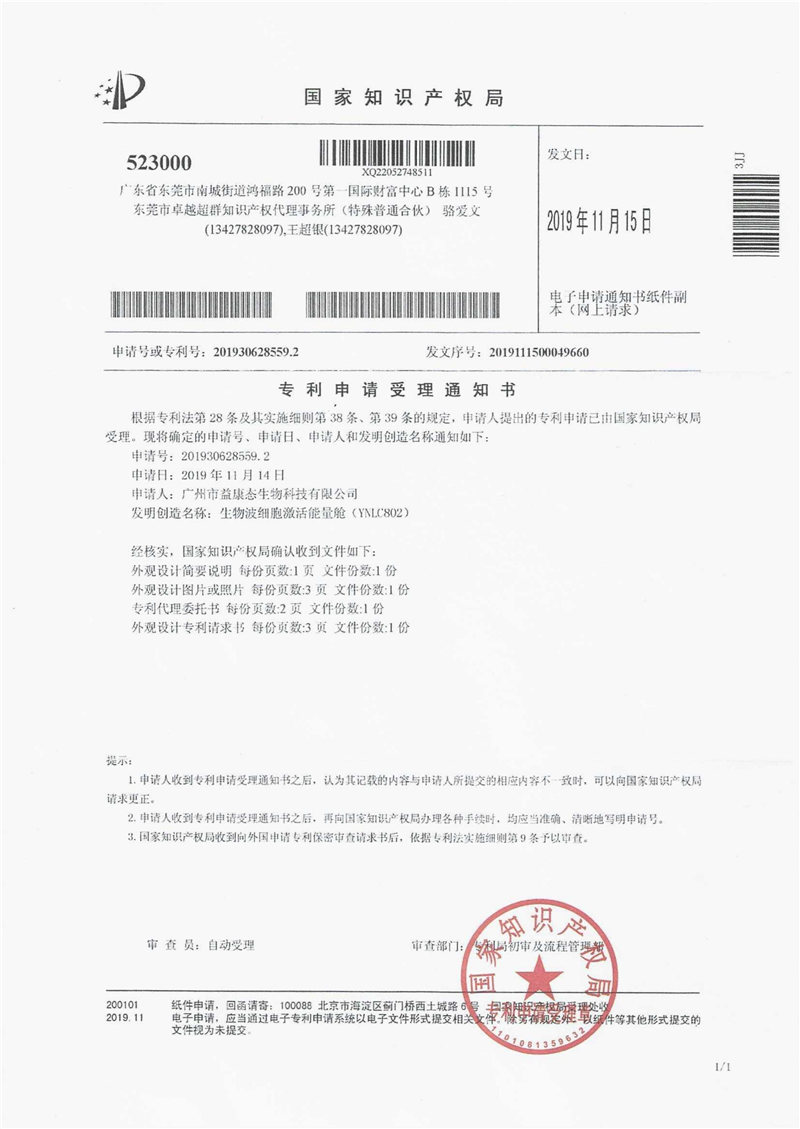 專利號:ZL201930621831.4  ZL201922075503.6生物波細胞激活能量艙型號:YNLC801A名稱:生物波細胞激活能量...